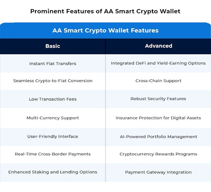 - Real-Time Cross-Border Payments : AA Smart Crypto Wallets eliminate the high fees connected with traditional banking services by enabling instantaneous and affordable international transfers through cross-border payment capabilities.