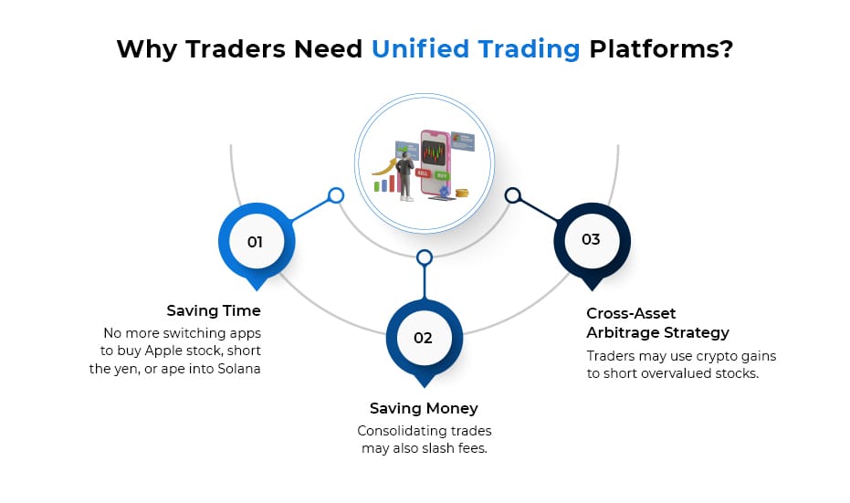 These markets are booming, but traders are juggling and drowning in tabs, apps, and fees. So, a unified platform that unites these major asset classes (stocks, forex, and crypto) empowers traders with unparalleled convenience, enhanced capital efficiency, and access to a diverse spectrum of investment possibilities, all within a single, integrated interface.