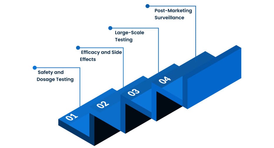 Phase 1: Test new drug for the first time on a small group of healthy volunteers to determine a safe dosage range and assess potential side effects.
