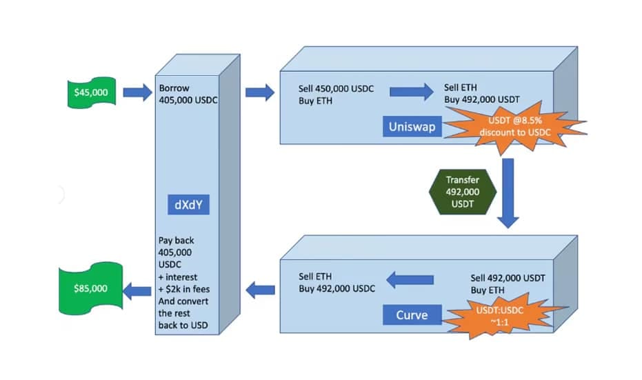 - Borrow Funds: The trader leveraged a crypto arbitrage bot to invest $45,000 in USDC tokens and borrowed an amount of 4,05,000 USDC from dXdY.