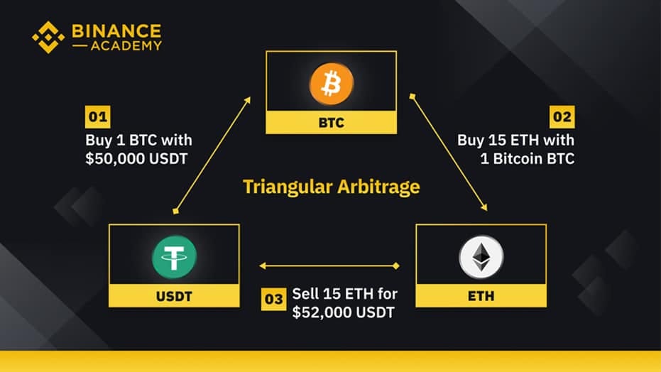 - Identify Arbitrage Opportunities: The crypto arbitrage bot detects a triangular arbitrage opportunity involving USDT, BTC, and ETH.