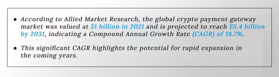 No business can grow fearlessly without finding secure ways of completing cross-border transactions. Not just this, it’s hard to deal with the complex regulatory frameworks, fluctuating currency exchange rates, high transaction fees, and lengthy settlement times. These are some of the challenges that create significant barriers for businesses looking to sell their products or services globally. So, what’s the solution? They can integrate a crypto payment gateway, the game-changer, in their selling platforms. The world of crypto payments is still young but it’s experiencing significant growth. In fact, crypto payment gateway development will offer a streamlined and cost-effective solution to facilitate global merchandising.