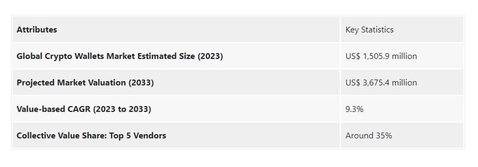 Crypto wallets have been envisioned as secure digital solutions responsible for holding Bitcoin or Ethereum. In reality, the potential of the wallets is way beyond that. The wallets are fuelled by blockchain technology and will transform numerous segments in the future. According to statistics, the market demand for crypto wallets is rising at 9.3% CAGR & is expected to gain US$ 3,675.4 million by 2033.