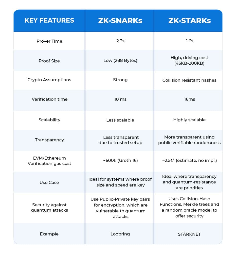 A trusted setup phase in ZK-SNARK is required that involves the development of a Common Reference String (CRS). If any malicious actors or hacktivists gain access to this setup data, they can affect the security of the system, generating false proofs. On the other hand, ZK-STARK implementation doesn’t require such a trusted setup phase, which makes it quantum-resistant & robust against security threats.
