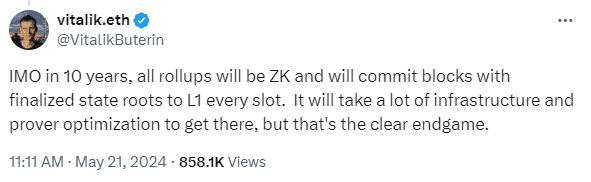 Among them, zero-knowledge rollups have garnered significant attention for their ability to enhance Ethereum’s scalability and cost-efficiency while maintaining security and decentralization. Vitalik Buterin, co-founder of Ethereum, has recently shared a post on X where he predicted a future dominated by zk rollups. His vision proposes a transition within a decade where all rollups will leverage zero-knowledge proofs for final state verification on the Ethereum mainchain.