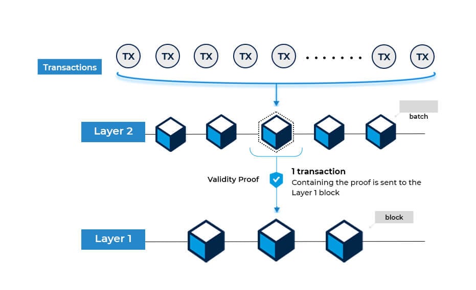 - Sequencing: Layer-2 operators, known as sequencers, collect and execute transactions off-chain and bundle them into batches. These batches are then submitted to the zk rollup smart contract on the layer-1 blockchain.