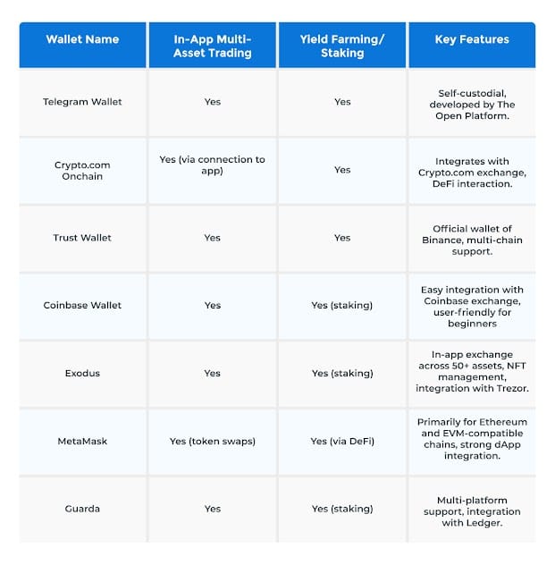 The following table summarizes some of the top cryptocurrency wallets that currently offer in-app multi-asset trading and yield features: