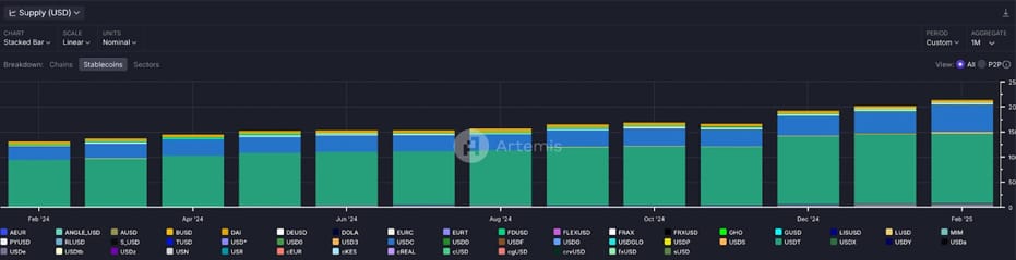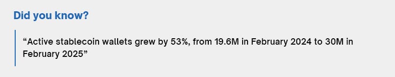 For instance, from February 2024 to February 2025, active stablecoin wallets increased by 53%, from 19.6 million to over 30 million, indicating a growing trust in these digital assets. Furthermore, the total stablecoin supply surged by 63% in the same period, reaching $225 billion, underscoring their expanding role in the financial ecosystem.