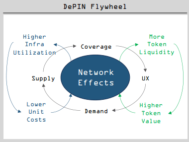 The DePIN Flywheel describes the self-reinforcing cycle that drives the network growth. Here’s how it works-
