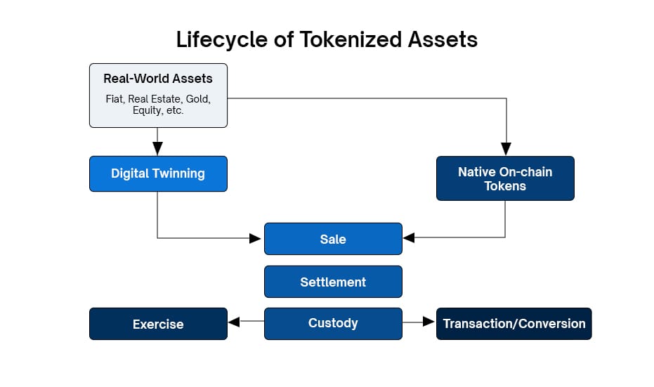 Both types enter the market through sales to investors, with transactions settled on-chain. Assets are then held either directly or by custodians. Owners can exercise associated rights (like redeeming for fiat) or participate in programmed conversions based on smart contracts.