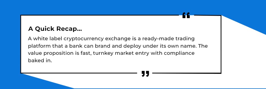 Meanwhile, Singapore hosts over 1,000 blockchain startups and Web3 companies and major banks (DBS, Standard Chartered, etc.) are actively “leveraging blockchain to streamline operations and offer innovative services. With so much momentum, a white label crypto exchange development platform lets any bank join these trends instantly. Instead of developing a complex exchange in-house (and re-learning each regulatory change), banks can plug into the thriving ecosystem.