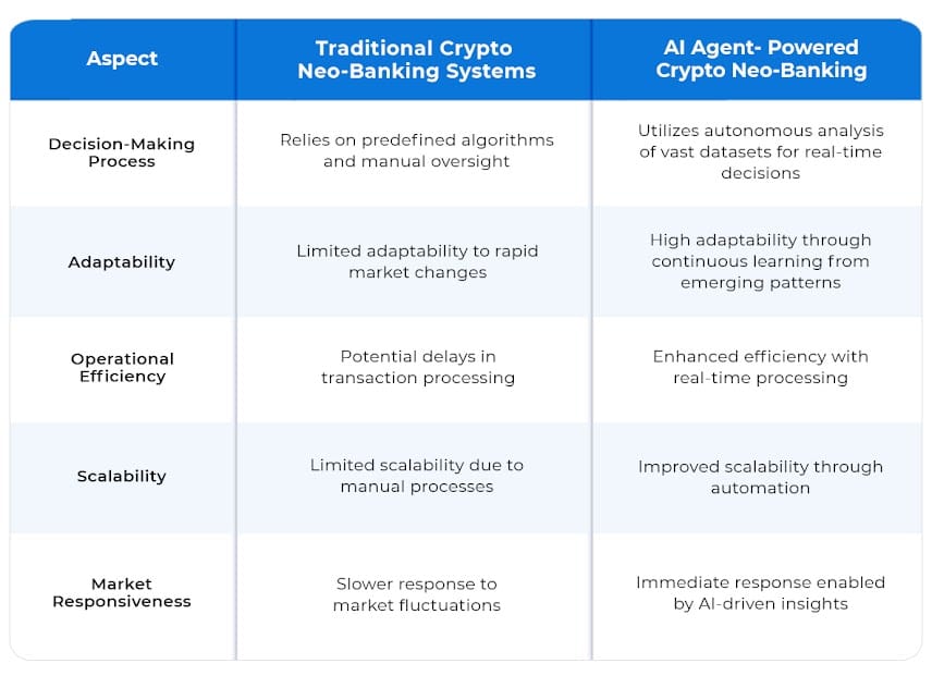 The integration of AI agents into crypto neo-banking solutions represents a significant evolution in the financial sector. Despite their innovation, traditional crypto neo-banking systems frequently rely on manual oversight and preset algorithms, which can limit their ability to adjust to swift changes in the market. AI agents, on the other hand, are made to independently examine enormous datasets, pick up on new trends, and make decisions in real time, all of which improve operational responsiveness and efficiency.