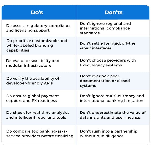 Before committing to any neo banking solution provider, it’s essential to know what separates a reliable platform from a short-sighted choice. Here’s a clear breakdown of strategic do’s and critical don’ts that will guide your selection process: