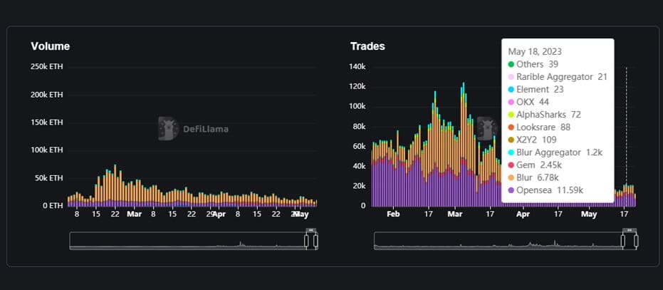 Let’s take a quick glance at the volume and trades of Blur and other popular NFT marketplaces so far: