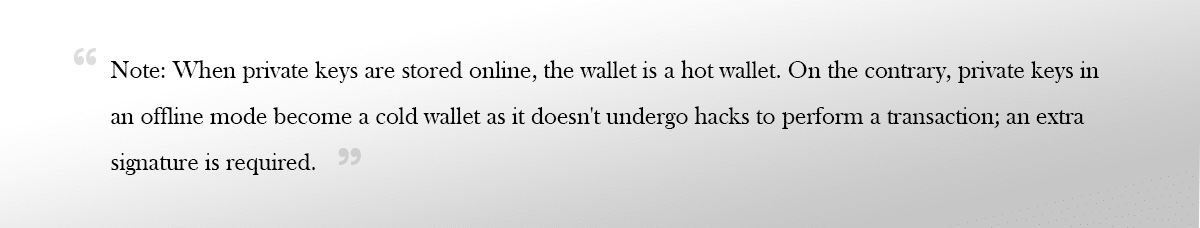 Wallets that operate on an offline mode basically fall under the category of cold wallets. It is the hardware device that stores the crypto assets safely. It is impossible to attempt hacks or breaches on the wallet. Trezor and Ledger are the prominent cold wallet category available in the market.