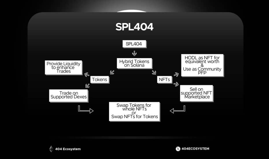 ✨ Programmable Functionality- SPL-404 goes beyond simply assigning token value to NFTs. It opens doors for developers to embed programmable functionalities within the tokens themselves. This paves the way for innovative applications like dynamic pricing mechanisms, royalty structures for creators, or even utility-based features within games or virtual worlds.