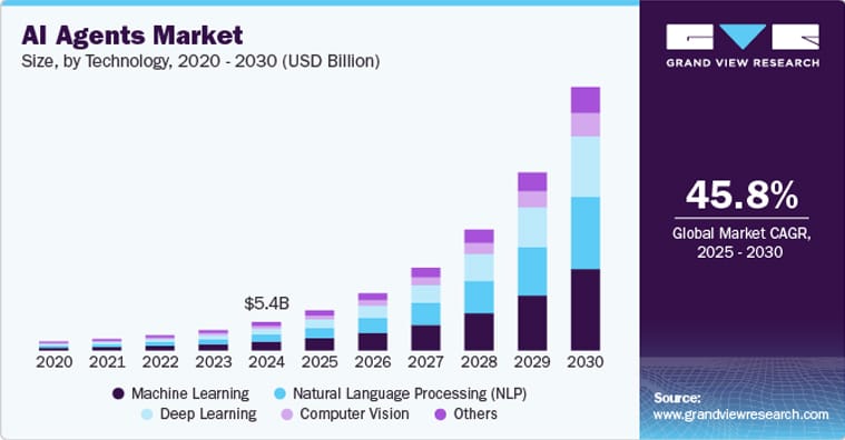 “According to Grand View Research, the global AI agents market size was estimated at USD 5.40 billion in 2024 and is expected to grow at a CAGR of 45.8% from 2025 to 2030.”