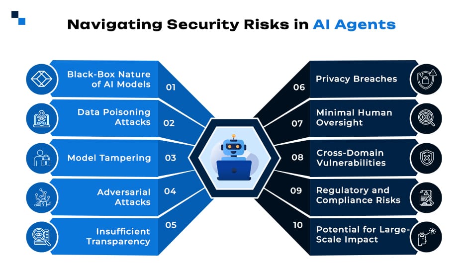 AI agents operate on a complex stack, including data ingestion, model inference, task execution, and communication. Each layer introduces potential attack surfaces, especially when agents are distributed, autonomous, and adaptive. Key risks include: