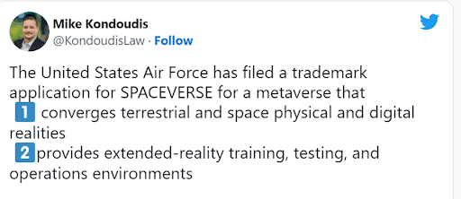 Mike Kondoudis, USPTO Trademark Attorney, said that the United States Air Force (USAF) aimed to patent a SPACEVERSE for training personnel and staff in extended reality (XR).