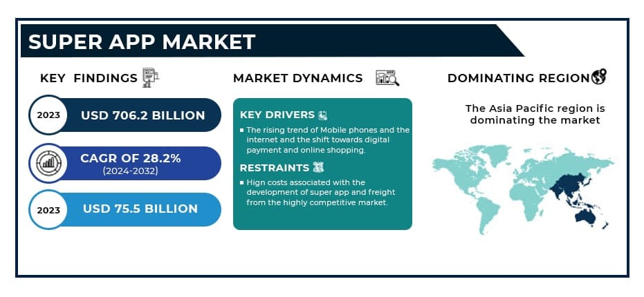 The super app market is projected to grow from USD 75.5 billion in 2023 to USD 706.2 billion by 2032, with a compound annual growth rate (CAGR) of 28.2% during the forecast period from 2024 to 2032.