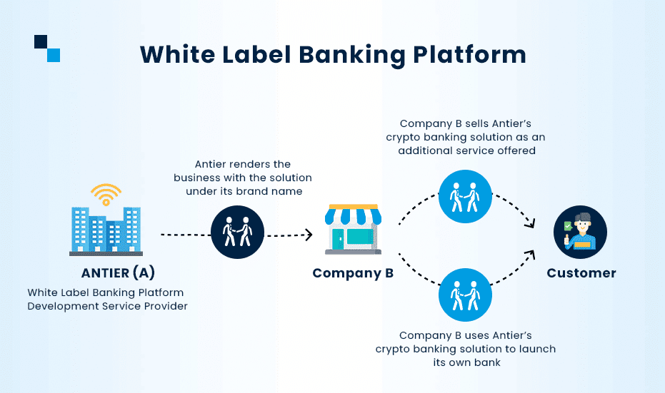 A white label crypto bank is a sort of financial institution that renders the platform for banking services and payments to other companies, who want to offer those services under their name. It’s more like outsourcing and the white label provider basically acts as a tech partner here, who structures and develops the platform for some other company under a white label.