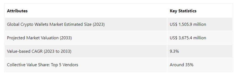 According to Future Market Insights, the wallet market will have a US $15.05.9 Million market revenue in 2023. It is expected to reach US $3675.4 Million by 2033. This means the segment will allow crypto enthusiasts to tap into the Million Dollar segment and boost their earning potential.