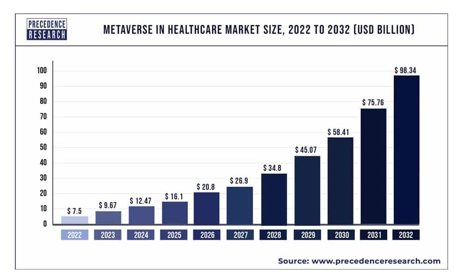 As per the predictions, the healthcare metaverse industry is anticipated to reach a valuation of around USD 98.34 billion by 2032, with a growth rate of 29.4% compound annual growth rate (CAGR) from 2023 to 2032.