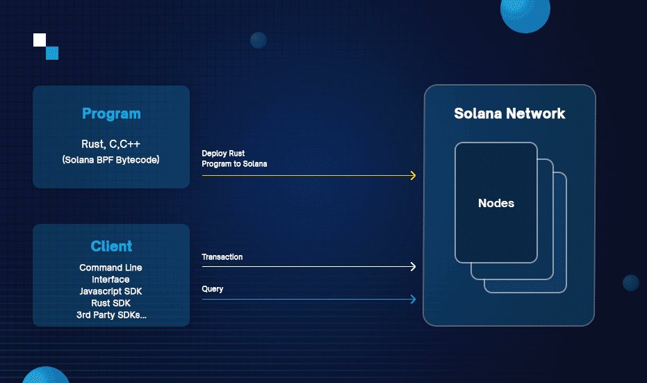 - In the above flowchart, the section “Program” enables users to create smart contracts with Rust, C, and C++ and deploy them on the Solana Blockchain.