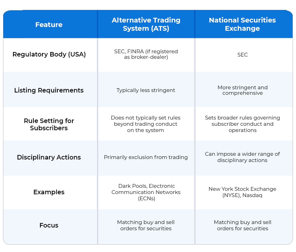 An alternative trading system is a regulatory-grade digital marketplace that facilitates the trading of securities outside traditional exchanges. In the U.S., ATS platforms operate under the oversight of the SEC and FINRA, enforcing rules that cover disclosure, investor protection, and cross-border compliance. ATS employs computerized systems to match buy and sell orders for securities. Unlike national securities exchanges, an alternative trading system platform does not have the same listing requirements or regulatory responsibilities, although it retains the option to apply for exchange status.
