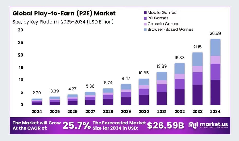 The Global Play-to-Earn (P2E) Market size is expected to be worth around USD 26.59 Billion By 2034, from USD 2.7 Billion in 2024, growing at a CAGR of 25.70% during the forecast period from 2025 to 2034. In 2024, North America led the play-to-earn (P2E) market with a 37.4% share, generating USD 1 billion in revenue.