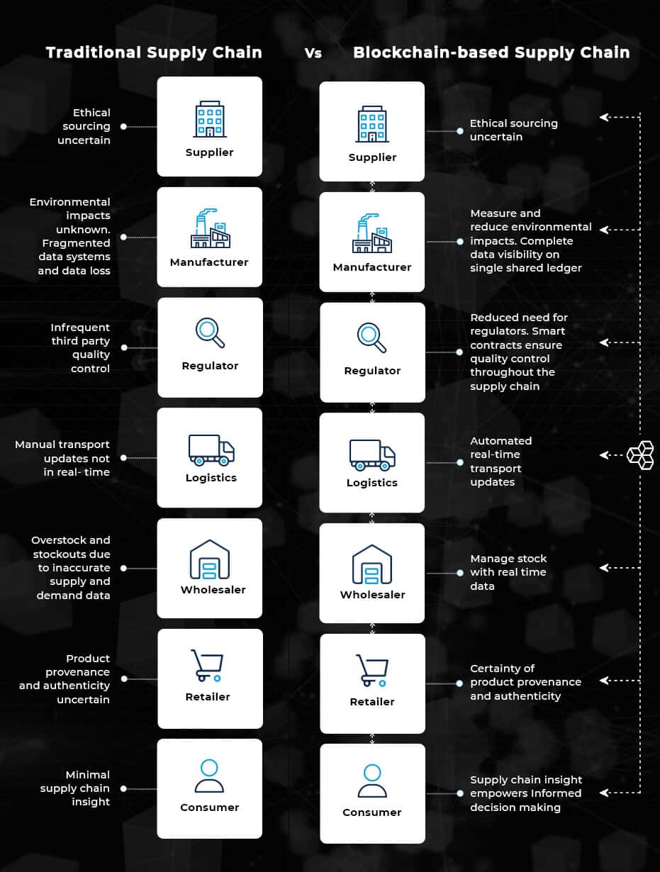 This blog sheds light on various Blockchain use cases in supply chain and how global leaders are utilizing Blockchain supply chain solutions to handle today’s disruptions. Before moving further, have a look at the flowchart depicting how a supply chain network works with Blockchain and without Blockchain.