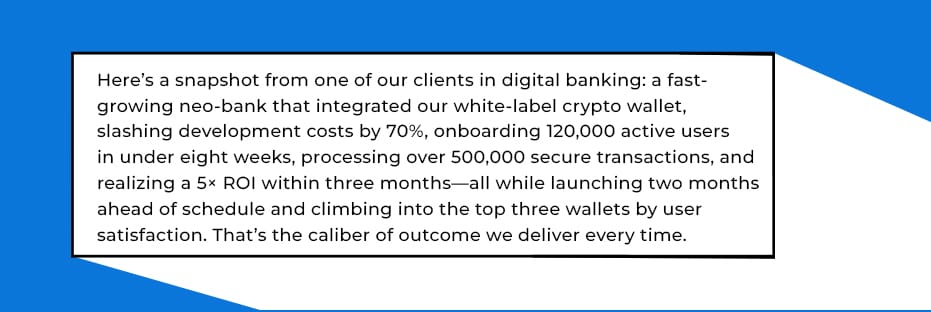 Here’s a snapshot from one of our clients in digital banking: a fast-growing neo-bank that integrated our white-label crypto wallet, slashing development costs by 70%, onboarding 120,000 active users in under eight weeks, processing over 500,000 secure transactions, and realizing a 5× ROI within three months—all while launching two months ahead of schedule and climbing into the top three wallets by user satisfaction. That’s the caliber of outcome we deliver every time.