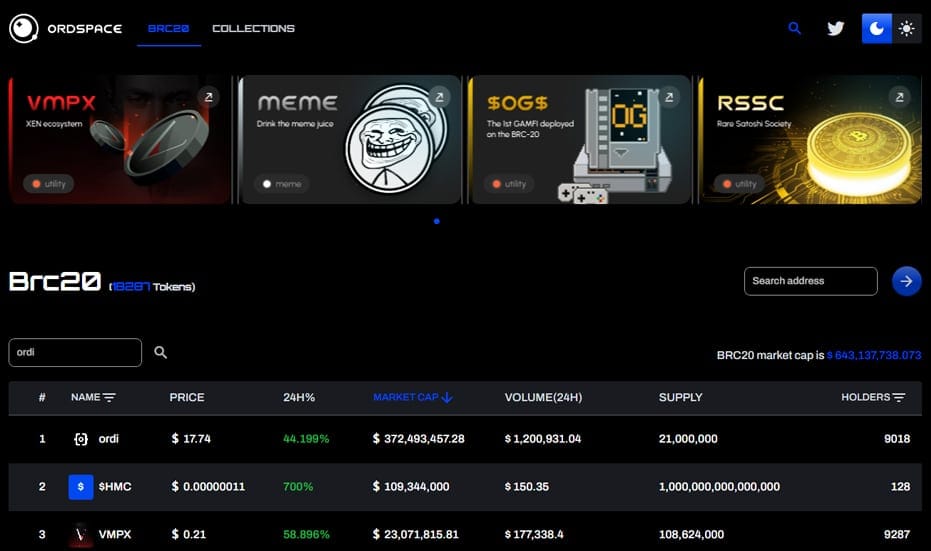According to ORDSPACE, a total of 18266 tokens based on BRC20 token standards have been minted so far, and the market cap was $ 573,009,828.386 on May 11, 2023. The current status can be seen here: