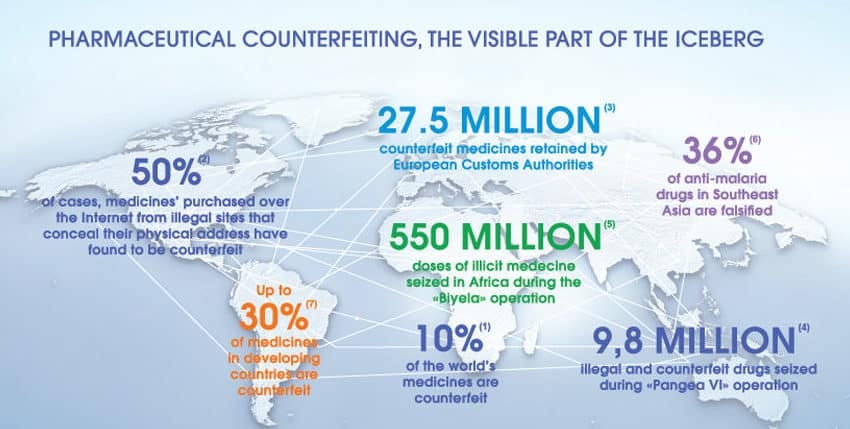 The International Institute for Anti-Counterfeit Drug Research also shows that medicine counterfeiting is between 10 and 25 times more profitable than narcotics trafficking.