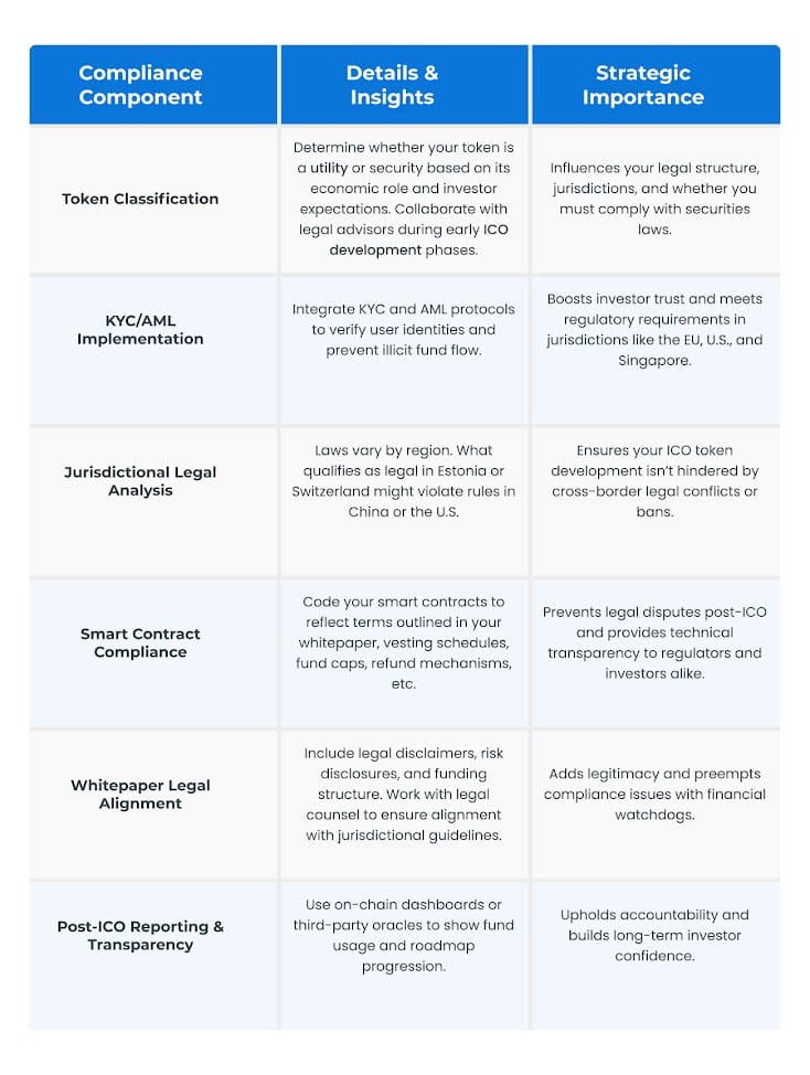 This meticulous structure reflects the depth of professional ICO development services that aim to deliver high-impact token launches. However, even the most technically sound ICO can falter without a strong compliance backbone. That’s why the next critical step is ensuring your ICO aligns with global legal and regulatory standards from day one.