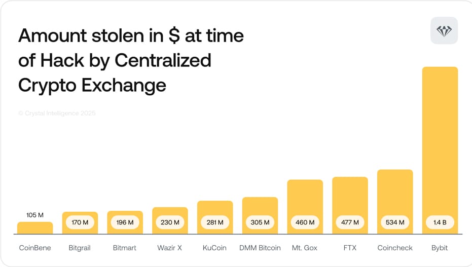 One possible reason why all centralized exchanges are rushing to adopt this hybrid approach is be vulnerability of hot wallets and stolen funds from centralized services. The following graph from Crystal Intelligence reveals the most notorious heists that targeted the centralized crypto world.