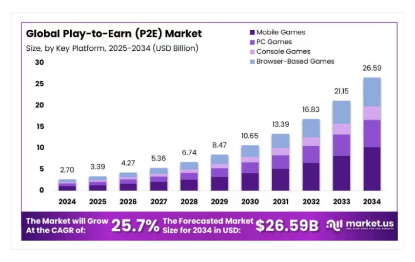 The global play-to-earn (P2E) market is projected to grow at a 25.7% CAGR, reaching USD 26.59 billion by 2034. North America’s stronghold is expected to continue, with the U.S. market alone growing at a 24.2% CAGR through 2034.