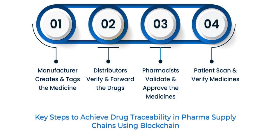 Embracing blockchain for drug traceability refers to using decentralized, immutable ledgers to record every step of a pharmaceutical product’s journey, from manufacturing to the end consumer. All stakeholders, including manufacturers, distributors, regulators, and healthcare providers, using blockchain can: